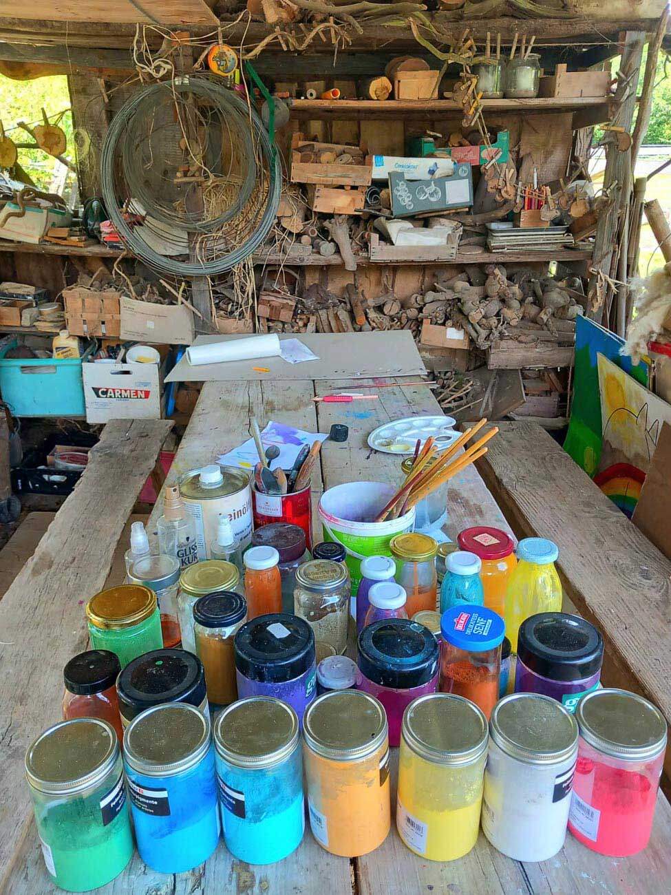 Christina Stoschus-Schumann stellt ihre NaturMaterialSammlung aus heimischen Baumstücken, Steinen, Schneckenhäuschen, Muscheln, Federn, Roh- und Filzwolle, Edelsteinen uvm. zur Verfügung und gibt Anregungen, daraus NaturKunstwerke zu bauen. Ein besonderes Anliegen ist der Künstlerin auch das Herstellen und Verwenden von natürlichen wasserfesten Farben, die keinerlei Schadstoffe hinterlassen, wenn Naturkunst verwittert.