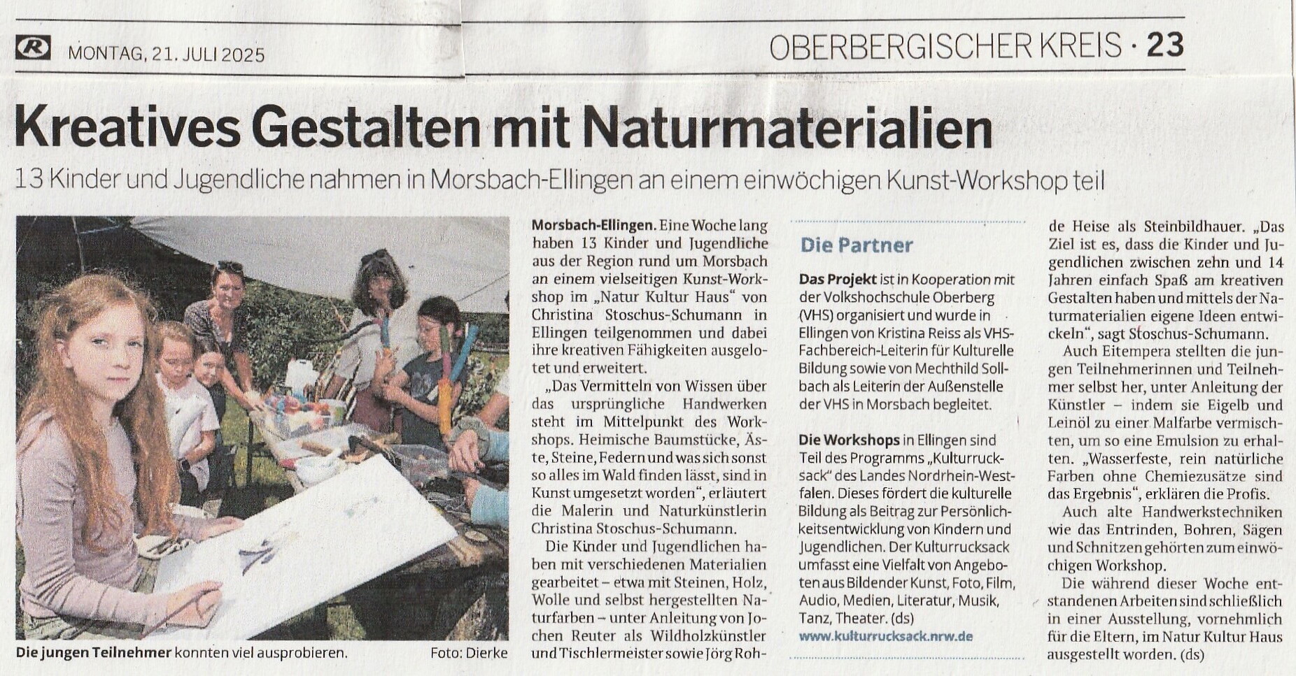 Die JugendKunstWoche ist eine Veranstaltung des NaturKulturhauses und dem Kulturrucksack NRW, in Zusammenarbeit mit der VHS Oberberg und der Gemeinde Morsbach. Für die Kinder und Jugendliche war die Teilnahme für die ganze Woche kostenlos.
